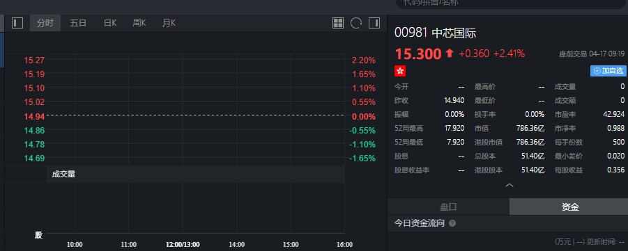 今日盘前交易时段,截至发稿,中芯国际涨2.41%,报15.30港元。