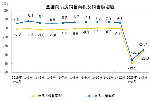 1—3月份,商品房销售面积21978万平方米,同比下降26.3%,降幅比1—2月份收窄13.6个百分点。其中,住宅销售面积下降25.9%,办公楼销售面积下降36.2%,商业营业用房销售面积下降35.1%。商品房销售额20365亿元,下降24.7%,降幅比1—2月份收窄11.2个百分点。其中,住宅销售额下降22.8%,办公楼销售额下降36.8%,商业营业用房销售额下降39.8%。
