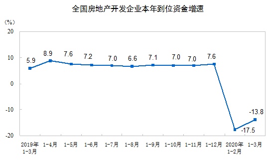1—3月份,房地产开发企业到位资金33566亿元,同比下降13.8%,降幅比1—2月份收窄3.7个百分点。其中,国内贷款6716亿元,下降5.9%;利用外资19亿元,下降42.5%;自筹资金10755亿元,下降8.8%;定金及预收款9542亿元,下降22.4%;个人按揭贷款5228亿元,下降7.4%。