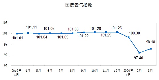 3月份,房地产开发景气指数(简称“国房景气指数”)为98.18,比2月份提高0.78点。