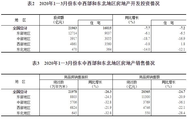 1—3月份,东部地区房地产开发投资12714亿元,同比下降6.1%,降幅比1—2月份收窄6.4个百分点;中部地区投资3917亿元,下降18.7%,降幅收窄7.2个百分点;西部地区投资4861亿元,下降0.8%,降幅收窄17.8个百分点;东北地区投资470亿元,下降14.0%,降幅收窄2.1个百分点。