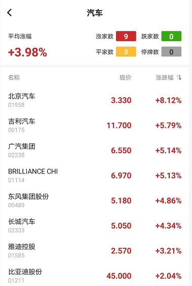 截至10时16分,北京汽车(01958)涨7.79%,报价3.32港元,吉利汽车(00175)涨5.61%,华晨中国(01114)涨5.43%,广汽集团(02238)涨5.14%,长城汽车(02333)涨3.93%,比亚迪股份(01211)涨2.04%。