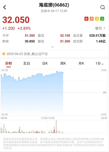港股异动︱近期获花旗上调目标价32.4%至32.7港元 海底捞(06862)现涨4%