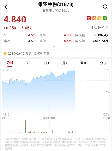 智通财经APP获悉,维亚生物(01873)获光大证券首予“买入”评级,目标价看高至6.92港元。截至14时13分,涨5.45%,报价4.84港元,成交额4446.73万。