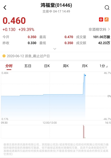 智通财经APP获悉,细价股鸿福堂(01446)午后无量上涨40%,创逾6个月新高,截至14时49分,涨39.39%,报价0.46港元,成交额42.23万。