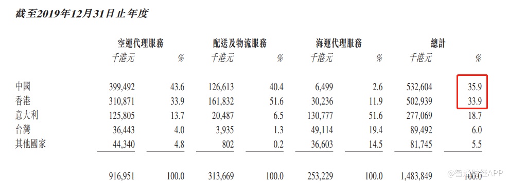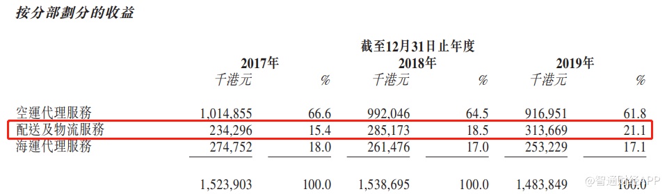 若从业务板块来看,空运代理服务及海运代理服务的收入逐年下降,而配送及物流服务的收入却稳步上升,从2017年的15.4%提升至2019年的21.1%,这说明公司逐渐向配送及物流服务发力。