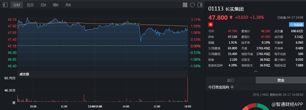 截至今日收盘,长实集团涨1.38%,报47.80港元。