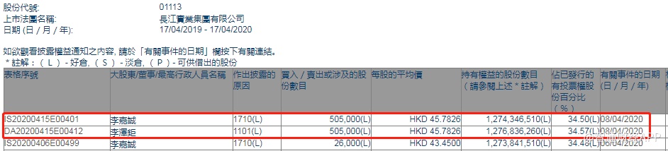 智通财经APP获悉,联交所最新资料显示,4月8日,李嘉诚与李泽钜增持长实集团(01113)50.5万股,每股作价45.7826港元,总金额约为2312.02万港元。增持后李嘉诚最新持股数目约为12.74亿股,最新持股比例为34.5%;李泽钜最新持股数目约为12.77亿股,最新持股比例为34.57%。