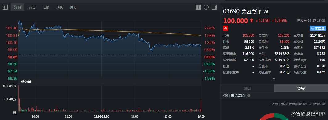 截至今日收盘,美团点评-W涨1.16%,报100.00港元。