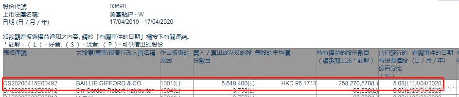 智通财经APP获悉,联交所最新资料显示,4月14日,BAILLIE GIFFORD & CO增持美团点评-W(03690)564.84万股,每股作价96.1713港元,总金额约为5.43亿港元。增持后最新持股数目约为2.58亿股,最新持股比例为5.08%。