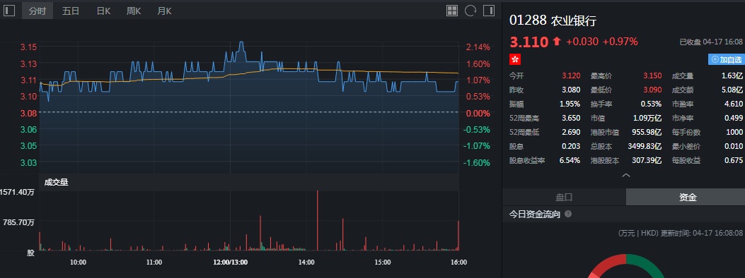 截至今日收盘,农业银行涨0.97%,报3.11港元。