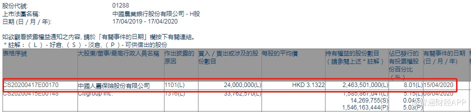 智通财经APP获悉,联交所最新资料显示,4月15日,中国人寿保险股份有限公司增持农业银行(01288)2400万股,每股作价3.1322港元,总金额约为7517.28万港元。增持后最新持股数目约为24.64亿股,最新持股比例为8.01%。