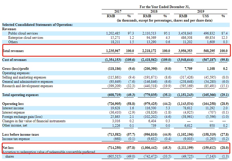 招股书显示,2017-19年,金山云的营收分别是12.35亿,22.18亿和39.56亿元(单位:人民币,下同)。净亏损分别为7.14亿,10亿和11.1亿元。
