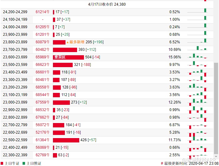 智通财经APP获悉,截至4月17日,恒指最新的牛熊街货比例36:64。法兴恒指牛熊证街货分布图中的数据显示,熊证街货重货区在25000-25099区间,该区间最新熊证数量为1198张,较上一交易日增加61张,最多新增在26300-26399区间,该区间最新熊证数量为281张,较上一交易日增加202张。牛证街货重货区在23600-23699区间,该区间最新牛证数量为504张,较上一交易日减少14张,最多新增在23800-23899区间,该区间最新牛证数量为205张,较上一交易日增加196张。
