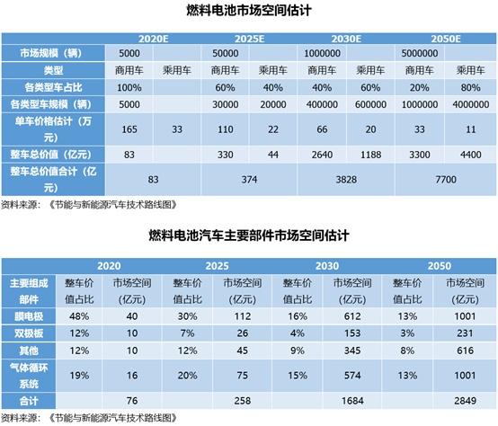 而根据我国《节能与新能源汽车技术路线图》中对燃料电池汽车总体技术路线的规划可知,2020年,计划实现燃料电池汽车在特定地区公共服务用车领域的小规模示范应用,要达到5000辆规模;2025年在城市私人用车、公共服务用车领域实现大批量应用,达到5万辆规模;2030年在私人乘用车、大型商用车领域实现大规模商用化推广,达到百万辆规模。根据以上数据,结合国内燃料电池汽车商用车、乘用车发展现状,预计2050年燃料电池汽车市场规模将达到500万辆,假设2020年5000辆全部为商用车,2025年的50000辆中60%为商用车,2030年的100万辆中40%为商用车,2050年500万辆中20%为商用车。预计燃料电池汽车整车市场空间2030年将超过3000亿,2050年有望突破7000亿。预计燃料电池汽车系统关键零部件的市场空间2030年将超过2000亿,2050年将超过3000亿。预计到2050年,燃料电池汽车整车加各零部件市场空间将突破万亿。同时随着氢燃料电池汽车产业化的成熟,未来在船舶、无人机等交通领域以及储能、电力等民生领域有望开创更多应用场景。