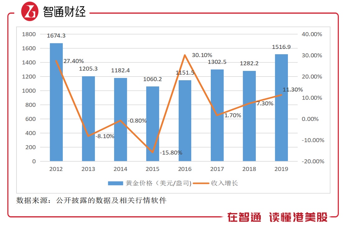 该公司业务收入对黄金价格有较高的敏感性,以历史上看,2013-2015年,黄金价格步入回调期,该公司的收入也跟着下滑,2015-2019年,黄金价格经历了四年长牛,而该公司的收入也保持着正向增长。