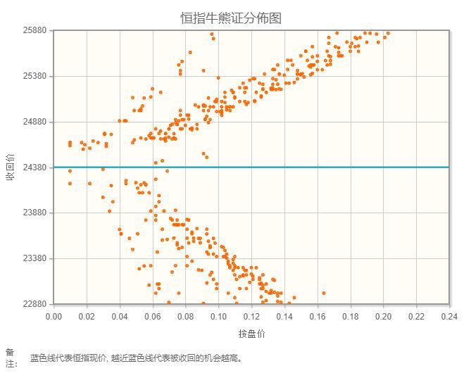 从恒生指数牛熊街货分布情况看,24380指数位置牛熊证分散,恒生指数缺少主见。