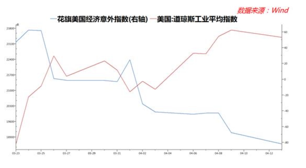 在过去近一个月的时间里,花旗美国经济意外指数和道指的负关联度达到了近85%。