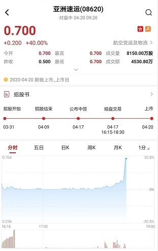 智通财经APP获悉,亚洲速运(08620)首日挂牌,公司拟发售1.2亿股,每股发售价0.5港元,每手5000股,所得款项净额约为1780万港元。截至9时20分,涨40%,报价0.7港元,成交额4530.8万。