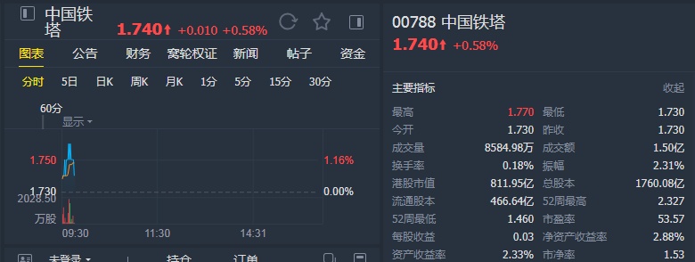 智通财经APP获悉, 花旗发表研究报告,上调中国铁塔(00788)目标价2.99%,由1.67港元调高至1.72港元,维持“中性”评级。