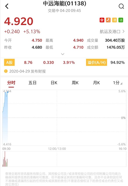 智通财经APP获悉,由于需求端不济,产油国继续增产,WTI原油跌至2001年11月以来最低水平。中金公司此前表示,预计油价在一段时间内处于低位,储油需求有望继续累积,支撑运价处于高位波动。中远海能(01138)继续走强,截至发稿,涨5.13%,报4.92港元,成交额1558.62万港元。