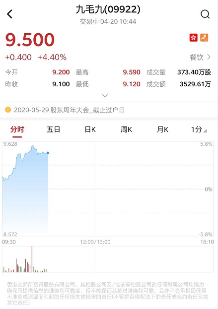 智通财经APP获悉,中金发表研究报告称,九毛九(09922)未来几年预计会高速成长,主要驱动力为酸菜鱼食店品牌“太二”的快速拓店,故首次覆盖并给予“跑赢行业”评级,目标价为11港元,报告指,受公共卫生事件影响,中期报告可能录得亏损,但公司2019-2021年净利润复合年增速有望仍达62%。截至发稿,九毛九涨4.4%,报9.5港元,成交额3545.74万港元。