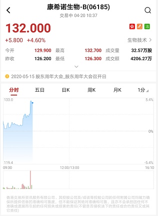 智通财经APP获悉,康希诺生物-B(06185)早盘股价止跌反弹,急升逾4%,突破5日均线。截至10时37分,涨4.6%,报132港元,成交额4206.27万港元。