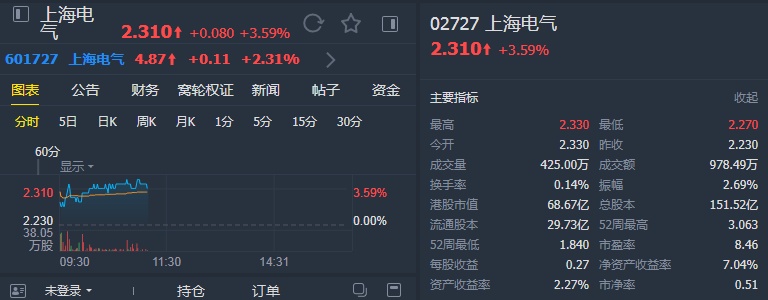 该行称,上调上海电气H股目标价3%至3.4港元,维持“增持”评级,并调升集团今明两年每股盈利预测4%,认为集团H股估值被低估,相当于明年预测市盈率9倍,对比同业平均为15倍。