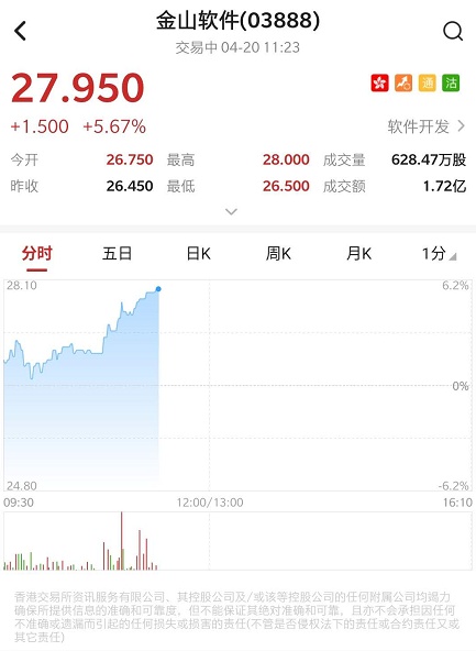 智通财经APP获悉,4月17日,雷军旗下云服务公司金山云控股有限公司向美国证券交易委员会提交招股书,计划募集至多1亿美元资金。此外,金山办公公司总经理章庆元表示,WPS海外月活总量已经突破一个亿。受消息影响,金山软件(03888)早盘走强,截至发稿,涨5.48%,报27.9港元,成交额1.72亿港元。