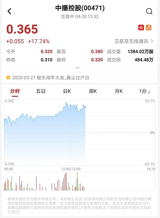 智通财经APP获悉,中播控股(00471)获主席兼执董黄秋智增持122万股,涉资约40.63万港元。截至13时32分,涨17.74%,报0.365港元,成交额484.48万港元。