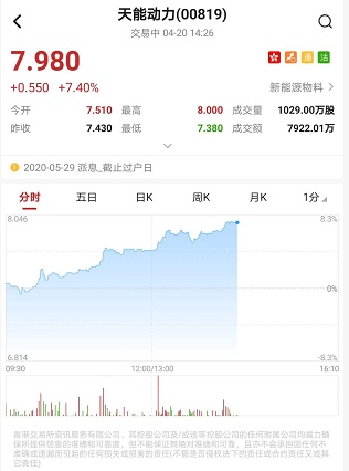 智通财经APP获悉,电池概念股整体表现活跃,天能动力(00819)午后涨幅扩大逾7%,高见8港元,创逾一年新高。截至14时26分,涨7.4%,报7.98港元,成交额7922.01万港元。
