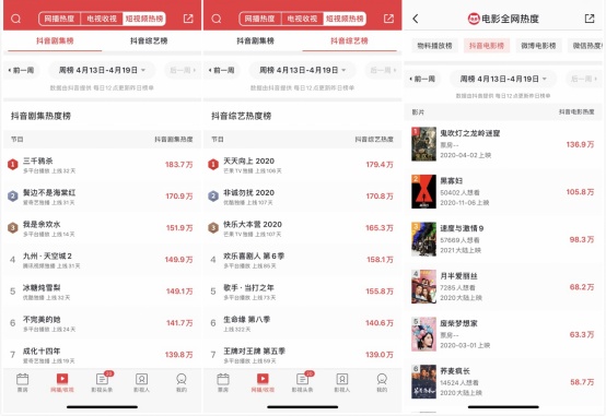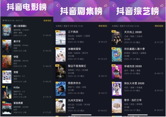 此次上线的抖音热度榜,每日12点更新当周影视项目热度数据,通过排行榜直观展现电影、剧集、综艺在抖音平台的一周热度值及排名。如在截止到4月19日的当周热度榜中,《三千鸦杀》《天天向上2020》《鬼吹灯之龙岭迷窟》分别占据抖音剧集、综艺、电影榜首。