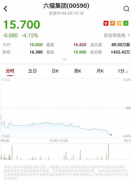 智通财经APP获悉,六福集团(00590)宣布,集团于2020财政年度第四季零售业务整体同店销售增长大幅下跌57%,黄金产品及珠宝首饰产品的同店销售增长分别为-51%及-64%。截至发稿,六福集团跌4.15%,报15.7港元,成交额1432.43万港元。