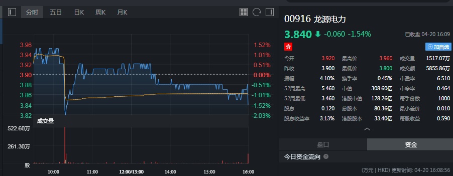 截至今日收盘,龙源电力跌1.54%,报3.84港元。