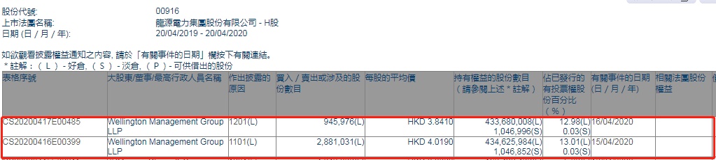 而后在4月16日,Wellington Mgt减持龙源电力94.5976万股,每股作价3.841港元,总金额约为363.35万港元。最新持股数目约为4.34亿股,最新持股比例为12.98%。