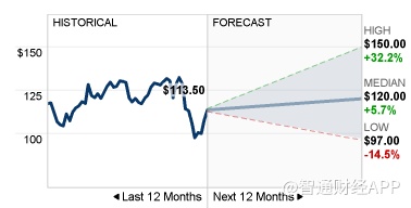 股价方面,在未来12个月内,27位分析师预计该公司股价的预估中值为120美元,最高位150美元,最低为97美元,该预估中值较上一次的113.5美元上升了5.7%。