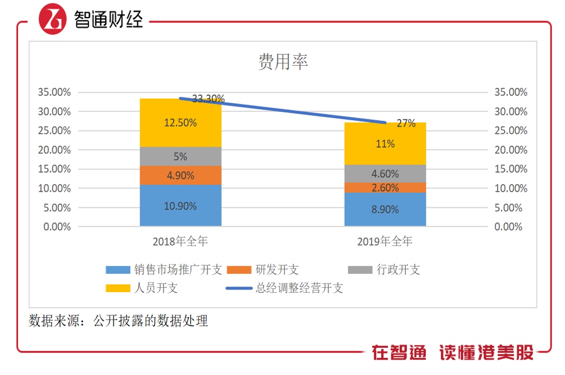 经调整的EBITDA的大幅度改善,得益于雷蛇运营费用的优化。该公司运营费用主要为销售费用、研发费用和行政费用,2019年三项费用率合计为27.0%,较2018年630個基点。