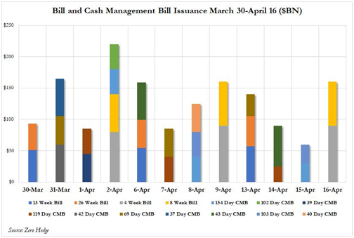 财政部释放了史无前例的短期国债的发行海啸,如下所示,在过去12个交易日中,新发的短债和现金管理票据总额达到创纪录的1.5万亿美元。