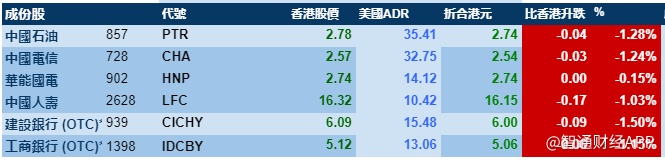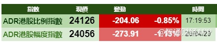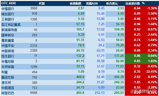 智通财经APP获悉,隔夜美股大跌,带动港股ADR指数表现偏软,按比例计算,收报24126点,跌204.06点或0.85%。