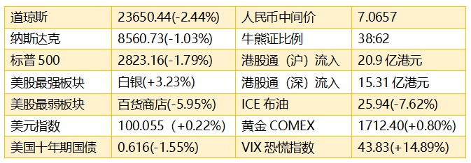1、隔夜美股受油价暴跌影响下跌。收盘标普500指数跌51.40点,跌幅1.79%,报2823.16点;纳指跌89.40点,跌幅1.03%,报8560.73点;道指跌592.10点,跌幅2.44%,报23650.44点。港股ADR指数表现偏软,按比例计算,收报24126点,跌204.06点或0.85%。