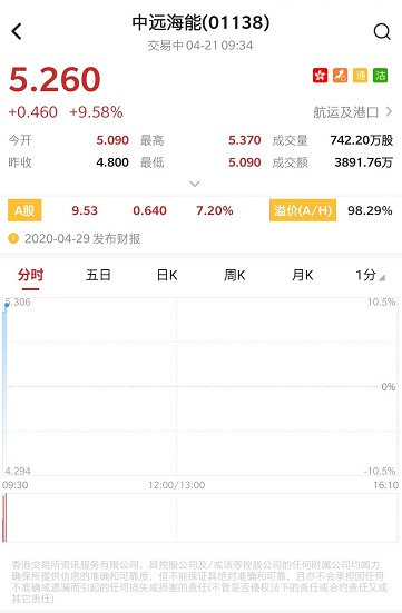 智通财经APP获悉,WTI原油5月期货收跌55.9美元,报-37.63美元/桶,历史上首次收于负值,空头逼仓凸显油储供应紧张。中金公司此前表示,储油需求有望继续累积,支撑运价处于高位波动。中远海能(01138)早盘高开高走,截至发稿,涨8.96%,报5.23港元,成交额4359.7万港元。