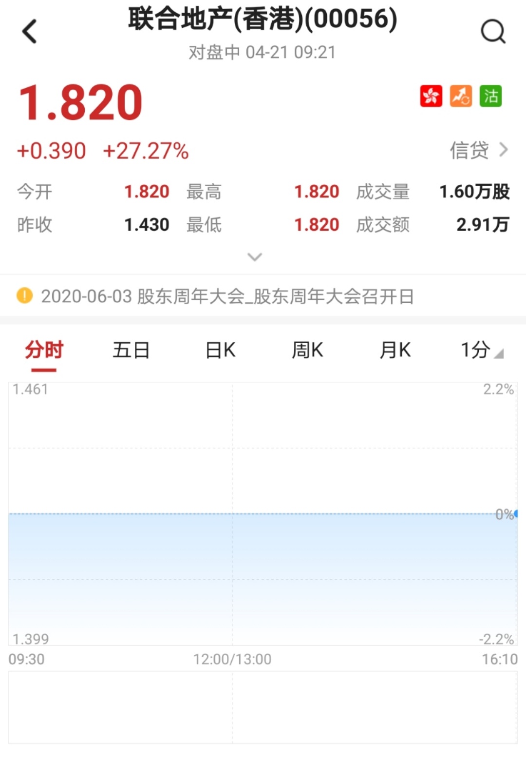 智通财经APP获悉,联合地产(香港)(00056)获联合集团(00373)提私有化,今日复牌,早盘跳空高开,创52周新高。截至9时20分,涨27.27%,报价1.82港元,成交额2.91万。
