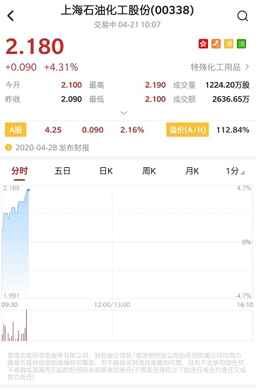 智通财经APP获悉,根据联交所最新资料显示,4月14日,贝莱德增持上海石油化工股份(00338)5557.95万股,每股作价2.0219港元,总金额约为1.12亿港元。截至发稿,上海石油化工股份涨4.31%,报2.18港元,成交额2783.47万港元。
