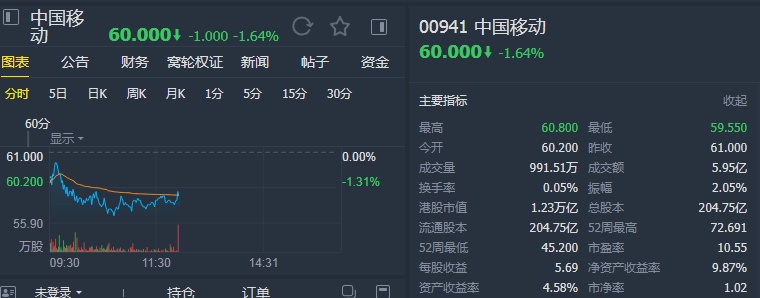 该行另外指出,中国移动首季纯利为235亿元人民币,同比微跌0.8%,占该行今年预期的24.4%。公司力争在今年维持稳定的纯利水平。该行将公司2020至2022年的EBITDA预测下调3.6%至4%,以反映5G相关网络成本上升,并将盈利预测上调2%至4.4%,以反映更低的折旧成本。将其目标价由64港元下调至61.8港元,维持“中性”投资评级。