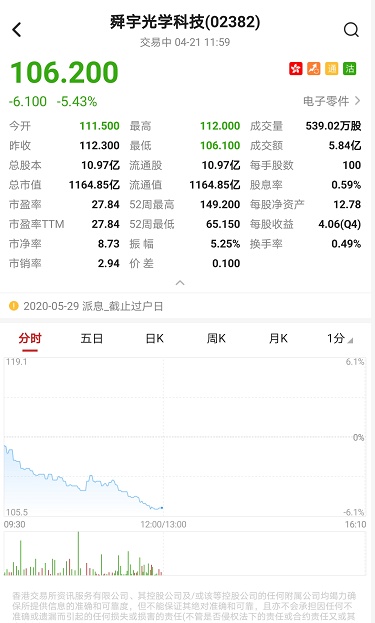 智通财经APP获悉,舜宇光学科技(02382)近日港股通持股比例大幅回落,盘中股价持续下挫,截至11时59分,跌5.43%,报价106.2港元,成交额5.84亿。