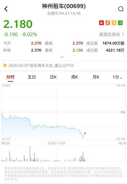 智通财经APP获悉,受瑞幸咖啡(LK.US)财务造假影响,新三板神州优车停牌接近两周,今天复牌大跌近三成。神州优车两个交易日累计跌去44%。神州租车(00699)午后加速下挫,截至发稿,跌8.02%,报2.18港元,成交额4221.18万港元。