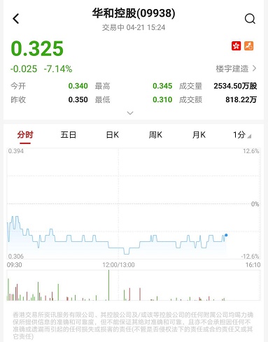 智通财经APP获悉,次新股华和控股(09938)闪崩后股价阴跌不止,盘中以0.31港元,再度刷新上市新低,发售价为0.5港元。截至15时24分,跌7.14%,报价0.325港元,成交额818.22万。