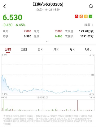 智通财经APP获悉,江南布衣(03306)股价大幅回落,盘中跌破多条均线。截至15时59分,跌6.45%,报价6.53港元,成交额1191.02万。