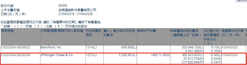智通财经APP获悉,联交所最新资料显示,4月15日,摩根大通减持金蝶国际(00268)722.6991万股,每股作价11.0522港元,总金额约为7987.41万港元。减持后最新持股数目约为3.63亿股,最新持股比例为10.90%。