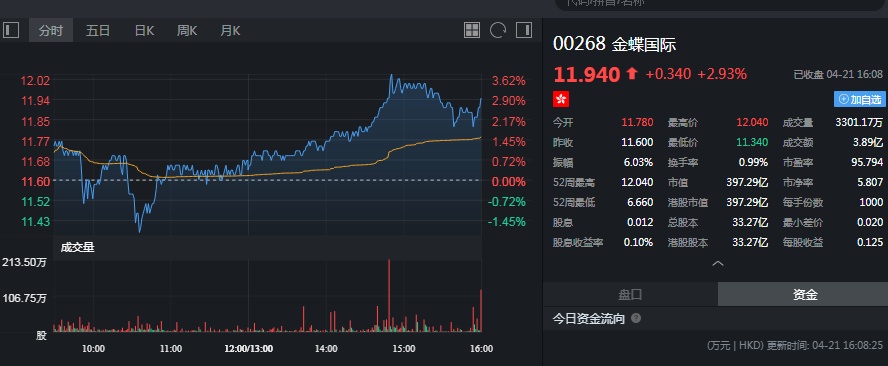 截至今日收盘,金蝶国际涨2.93%,报11.94港元。